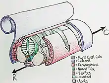 After gastrulation, neural crest cells are specified at the border of the neural plate and the non-neural ectoderm. During neurulation, the borders of the neural plate, also known as the neural folds, converge at the dorsal midline to form the neural tube.[3] Subsequently, neural crest cells from the roof plate of the neural tube undergo an epithelial to mesenchymal transition, delaminating from the neuroepithelium and migrating through the periphery where they differentiate into varied cell types.[1] The emergence of neural crest was important in vertebrate evolution because many of its structural derivatives are defining features of the vertebrate clade.[4]