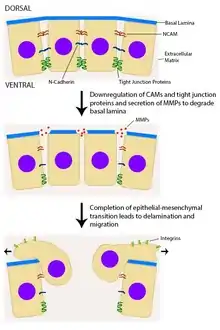Prior to delamination, presumptive neural crest cells are initially anchored to neighboring cells by tight junction proteins such as occludin and cell adhesion molecules such as NCAM and N-Cadherin.[20] Dorsally expressed BMPs initiate delamination by inducing the expression of the zinc finger protein transcription factors snail, slug, and twist.[17] These factors play a direct role in inducing the epithelial-mesenchymal transition by reducing expression of occludin and N-Cadherin in addition to promoting modification of NCAMs with polysialic acid residues to decrease adhesiveness.[17][21] Neural crest cells also begin expressing proteases capable of degrading cadherins such as ADAM10[22] and secreting matrix metalloproteinases (MMPs) that degrade the overlying basal lamina of the neural tube to allow neural crest cells to escape.[20] Additionally, neural crest cells begin expressing integrins that associate with extracellular matrix proteins, including collagen, fibronectin, and laminin, during migration.[23] Once the basal lamina becomes permeable the neural crest cells can begin migrating throughout the embryo.