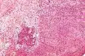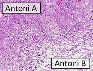 Micrograph of a schwannoma showing both a cellular Antoni A area (top) and a loose paucicellular Antoni B area (bottom). HE stain.