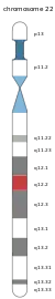NF2 is caused by a defect in the gene that normally gives rise to a product called Merlin or Schwannomin, located on chromosome 22 band q11-13.1. Merlin was first discovered as a structural protein functioning as an actin cytoskeleton regulator. Later merlin's tumour suppressant role was described. Merlin regulates multiple proliferative signalling cascades such as receptor tyrosine kinase signalling, p21-activated kinase signalling, Ras signalling, MEK-ERK cascade, MST-YAP cascade.[8] In a normal cell, the concentrations of active (dephosphorylated) merlin are controlled by processes such as cell adhesion (which would indicate the need to restrain cell division). It has been shown that Merlin inhibits Rac1 which is crucial for cell motility and tumour invasion.[9] Also, merlin's interaction with cyclin D was described.[10] It is known that Merlin's deficiency can result in unmediated progression through the cell cycle due to the lack of contact-mediated tumour suppression, mainly because of the cell:cell junction disruption, sufficient to result in the tumors characteristic of Neurofibromatosis type II. Recent studies showed that besides its cytoskeletal and cytoplasmic functions Merlin also translocates to the nucleus and suppresses proliferation by inhibiting E3 ubiquitin ligase CRL4(DCAF1).[11] Finally, most recent studies indicated that Merlin also plays important role in energy metabolism regulation.[12][13] Mutations of NF2 is presumed to result in either a failure to synthesize Merlin or the production of a defective peptide that lacks the normal tumor-suppressive effect. The Schwannomin-peptide consists of 595 amino acids. Comparison of Schwannomin with other proteins shows similarities to proteins that connect the cytoskeleton to the cell membrane. Mutations in the Schwannomin-gene are thought to alter the movement and shape of affected cells with loss of contact inhibition. Ependymomas are tumors arising from the ependyma, an epithelium-like tissue of the central nervous system.[14] In people with NF2 and ependymomas, the tumor suppressant function of Merlin may be compromised. Loss of function mutations occurring in chromosome 22q, where Merlin proteins are coded, can promote tumorigenesis, or the creation of new tumorous cells.[6] Deletions, too, in the NH2-terminal domain of merlin proteins have been associated with early tumor onset and poor prognosis in affected people.[6]