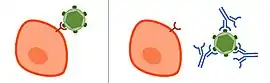 In order to enter cells, pathogens, such as circulating viral particles or extracellular bacteria, use molecules on their surfaces to interact with the cell surface receptors of their target cell which allows them to enter the cell and start their replication cycle.[5] Neutralizing antibodies can inhibit infectivity by binding to the pathogen and blocking the molecules needed for cell entry. This can be due to the antibodies statically interfering with the pathogens, or toxins attaching to host cell receptors. In case of a viral infection, NAbs can bind to glycoproteins of enveloped viruses or capsid proteins of non-enveloped viruses. Furthermore, neutralizing antibodies can act by preventing particles from undergoing structural changes often needed for successful cell entry. For example, neutralizing antibodies can prevent conformational changes of viral proteins that mediate the membrane fusion needed for entry into the host cell.[5] In some cases, the virus is unable to infect even after the antibody dissociates. The pathogen-antibody complex is eventually taken up and degraded by macrophages.[6]