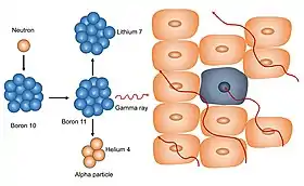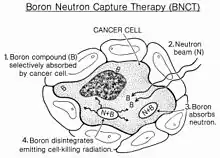![]() a. BNCT is based on the neutron capture and decay reactions that occur when boron-10 is irradiated with low-energy (0.0025 eV) thermal neutrons. The resulting 10B(n,α)7Li capture reaction yields high linear energy transfer (LET) α particles (stripped down helium nuclei [4He]) and recoiling lithium-7 (7Li) atoms. b. The short range (5-9 μm) of the α particles limits the destructive effects to the boron-containing cells. In theory, BNCT can selectively destroy malignant cells while sparing adjacent normal tissue if the requisite amounts of 10B and neutrons are delivered to the tumor cells. Reprinted from Barth RF, Mi P, Yang W (June 2018). "Boron delivery agents for neutron capture therapy of cancer". Cancer Communications. 38 (1): 35. doi:10.1186/s40880-018-0299-7. PMC 6006782. PMID 29914561). | |