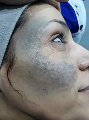 A Q-switched 1064 nm laser has been successfully used to treat the condition.[7][8] The Q-switched lasers (694 nm ruby, 755 nm Alexandrite or 1064 nm Nd-YAG) with their high peak power and pulse width in nano second range are best suited to treat various epidermal, junctional, mixed and dermal lesions. The Q-switched 1064 nm Nd-YAG is an ideal choice to treat dermal pigment as in nevus of Ota and in darker skin types, as it reduces the risk of epidermal injury and pigmentary alterations. The pigment clearance can be expected to be near total, using multiple treatment sessions, each separated by a minimum of six weeks. The number of treatments required depends on the severity of the lesion. A darker lesion needs more treatments. The outcome also depends to some extent on the power output and quality of the laser system. Last but not least, the skill of the laser surgeon plays a role in achieving early and good clearance.[9]