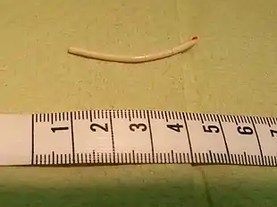 Nexplanon/Implanon consists of a single rod made of ethylene vinylacetate copolymer that is 4 cm long and 2 mm in diameter.[31] It is similar to a matchstick in size. The rod contains 68 mg of etonogestrel (sometimes called 3-keto-destrogestrel), a type of progestin.[24] Peak serum etonogestrel concentrations have been found to reach 781–894 pg/mL in the first few weeks, gradually decreasing to 192–261 pg/mL after one year, 154–194 pg/mL after two years, and 156–177 pg/mL after three years, maintaining ovulation suppression and contraceptive efficacy.[37] Serum levels maintain relatively stable through 36 months, which implies that the method may be effective for longer than three years.[38]