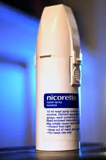 The product range encompasses chewing gum,[3][4][5][6] lozenges,[4][5] patches[6] of two kinds (transparent and non-transparent),[4] oral spray (Nicorette QuickMist),[7] inhalator,[4][6] sublingual tablets (Nicorette Microtab)[4] and nasal spray.[4][8]