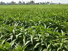 Nicotiana rustica, commonly known as Aztec tobacco[2] or strong tobacco,[3] is a rainforest plant in the family Solanaceae. It is a very potent variety of tobacco, containing up to nine times more nicotine than common species of Nicotiana such as Nicotiana tabacum (common tobacco).[4] More specifically, N. rustica leaves have a nicotine content as high as 9%, whereas N. tabacum leaves contain about 1 to 3%.[5] The high concentration of nicotine in its leaves makes it useful for producing pesticides, and it has a wide variety of uses specific to cultures around the world. However, N. rustica is no longer cultivated in its native North America, (except in small quantities by certain Native American tribes) as N. tabacum has replaced it.[6]