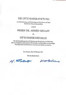 Adalat was the first German pharmaceutical to be awarded the highly prestigious Prix Galien in 1980.[28] In the same year, Ahmed Hegazy submitted his invention (in collaboration with Klaus-Dieter Rämsch) of an extended release, solid medicinal preparation of nifedipine to the German Patent Office in Munich, patenting the “use of nifedipine crystals with a specific surface area of 1-4 m2/g for the production of solid medicinal formulations for achieving long-lasting blood levels for the oral treatment of hypertension by administration 1 to 2 times”,[29] an invention that became known as Adalat retard from Bayer (see letter Dr Schauerte).[30] In that formulation, the active ingredient is released over a period of up to 36 hours.[31] With the increasing incidence of heart disease in that period—heart failure became the first cause of death in West Germany[32]—and the new formulation, the medication replaced Aspirin in the 1990s as the biggest single product of Bayer.[33] As Alexander Mey noted, "[d]iese Maßnahmen führten dazu, dass der Umsatz im Jahr 2000 auf 1,7 Mrd. US-$ stieg, obwohl das Präparat bereits ein Vierteljahrhundert am Markt war."[34] On 14 October 1991, Hegazy was awarded the Otto Bayer Medal—no relation to the company founder—for his work solubilizing poorly soluble active ingredients such as nifedipine, a prize, that the Bayer Group has been using to honor excellent research since 1984. By 2020, 528 researchers had received the award.[35] A 1995 US lawsuit, in which Hegazy defended his patent, found that Pfizer's Procardia XL product was also based on his European patent No. 0047899, United States Patent 5264446.[36]