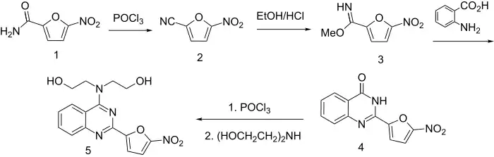 Treatment of the amide from 5-nitrofuroic acid with phosphorus oxychloride leads to the corresponding nitrile (2). This intermediate is then converted to the iminoether (3) with ethanolic hydrogen chloride. Condensation of anthranilic acid with the iminoether in the presence of sodium methoxide represents another method for preparing quinazolones. The reaction can be visualized as proceeding through the formation of the amidine from addition-elimination of anthranilic acid; cyclization then affords the observed product (4). The amide function is then converted to the iminochloride with phosphorus oxychloride. Displacement of the newly introduced halogen by means of diethanolamine affords nifurquinazol chlorine with diethanolamine leads to the formation of nifurquinazol (5), one of the antibacterial nitrofurans.