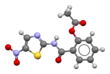 Nitazoxanide, sold under the brand name Alinia among others, is a broad-spectrum antiparasitic and broad-spectrum antiviral medication that is used in medicine for the treatment of various helminthic, protozoal, and viral infections.[4][5][6] It is indicated for the treatment of infection by Cryptosporidium parvum and Giardia lamblia in immunocompetent individuals and has been repurposed for the treatment of influenza.[1][6] Nitazoxanide has also been shown to have in vitro antiparasitic activity and clinical treatment efficacy for infections caused by other protozoa and helminths;[4][7] evidence as of 2014 suggested that it possesses efficacy in treating a number of viral infections as well.[6]