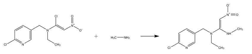 In the last step methylamine is added and reacts with the intermediate, replacing the pharmacophore chloride group, acquiring nitenpyram as the final end product.