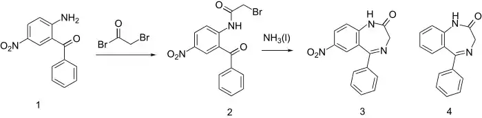 - Sternbach LH, Fryer RI, Keller O, Metlesics W, Sach G, Steiger N (May 1963). "Quinazolines and 1,4-Benzodiazepines. X. Nitro-Substituted 5-Phenyl-1,4-Benzodiazepine Derivatives". Journal of Medicinal Chemistry. 6 (3): 261–265. doi:10.1021/jm00339a010. PMID 14185980.