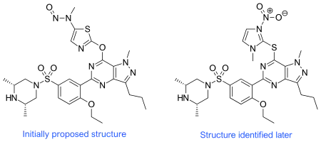 Shortly after Venhuis et al. published the suggested structure for nitrosoprodenafil, it was contested by Demizu et al. who suggested the structure was an azathioprine/aildenafil hybrid.[2] This newly suggested structure was dubbed 'mutaprodenafil' because of the structural similarity with the mutagenic azathioprine.