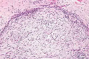 The histopathology and expressions of marker proteins in intravascular fasciitis tumors are also similar to NF. In comparison to NF, however, its spindle-shaped tumor cells are more often arranged in a storiformed (i.e. whirled) or haphazard pattern and have vesicle-containing nuclei with prominent nucleoli.[6]