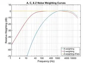 Researchers use different weights to account for noise frequency with intensity, as humans do not perceive sound at the same loudness level.[74] The most commonly used weighted levels are A-weighting, C-weighting, and Z-weighting. A-weighting mirrors the range of hearing, with frequencies of 20 Hz to 20,000 Hz.[74] This gives more weight to higher frequencies and less weight to lower frequencies.[74][79] C-weighting has been used to measure peak sound pressure or impulse noise, similar to loud short-lived noises from machinery in occupational settings.[79][80] Z-weighting, also known as zero-weighting, represents noise levels without any frequency weights.[79][80]
