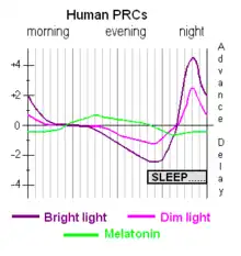Both melatonin administration and light therapy work by shifting circadian rhythms according to a phase response curve (PRC), with the melatonin PRC being essentially the inverse of the light PRC. Furthermore, light can suppress melatonin secretion.[2] Both have a duration of approximately 12 hours, in opposite phase: light PRC spikes at the beginning of the day and lowers throughout the day with a depression after 8 hours for the last 4 hours, whereas natural melatonin spikes at the start of the biological night and drops around the time of waking up or light perception. The first 8 hours are called the "advance zone" whereas the last few hours the "delay zone". The change from advancement to delay zones is progressive, passing through a long area of no effect (a "dead zone"), but the change from delay to advancement is abrupt, occurring a few hours before wake-up time or bedtime for light or melatonin respectively. When melatonin supplementation is taken in the melatonin PRC advance zone (i.e., the last few hours before bedtime), it resets the clock earlier; when taken in the melatonin PRC delay zone (i.e., few hours before and after wake-up time), it shifts the clock later. In other words, melatonin has most effect when it is taken at times when natural melatonin is not normally present, thus during the day: when taken in the morning, melatonin causes phase delays (shifts to a later time), and when taken in the afternoon/evening it causes phase advances (shifts to an earlier time). However, for a sleep phase delayed person, the time of biological morning and biological afternoon/evening might differ depending on the circadian clock shift in the affected person. This means that if melatonin is taken during the usual bedtime and wake-up time (i.e., usual nighttime), it may have no effect. Therefore, successful entrainment depends on both the melatonin dosage and the appropriate timing of melatonin administration. The accuracy needed for successfully timing the administration of melatonin might require a period of trial and error, as does the dosage. However, entrainment was also observed when giving a dose of melatonin as low as 0.05 mg and without any timing, by just continuing melatonin administration at the same time every day until their circadian rhythm shifted enough to coincide with melatonin administration (which took from 1 to 2 months).[2][43]