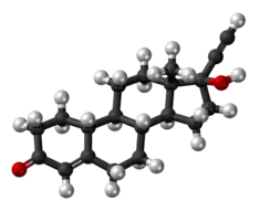 Norethisterone is weakly estrogenic (via conversion into its metabolite EE), and for this reason, it has been found at high dosages to be associated with high rates of estrogenic side effects such as breast enlargement in women and gynecomastia in men, but also with improvement of menopausal symptoms in postmenopausal women.[44] It has been suggested that very high dosages (e.g., 40 mg/day, which are sometimes used in clinical practice for various indications) of NETA (and by extension norethisterone) may result in an increased risk of venous thromboembolism (VTE) analogously to high dosages (above 50 μg/day) of EE, and that even doses of NETA of 10 to 20 mg, which correspond to EE doses of approximately 20 to 30 μg/day, may in certain women be associated with increased risk.[45][46] A study also found that ethinylestradiol and norethisterone had a greater influence on coagulation factors when the dose of norethisterone was 3 or 4 mg than when it was 1 mg.[47] This might have been due to additional ethinylestradiol generated by higher doses of norethisterone.[47]