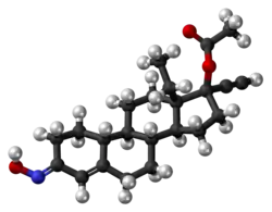 Norgestimate, also known as 17α-ethynyl-18-methyl-19-nortestosterone 3-oxime 17β-acetate or as 17α-ethynyl-18-methylestr-4-en-17β-ol-3-one 3-oxime 17β-acetate, is a synthetic estrane steroid and a derivative of testosterone.[23][6] It is a racemic mixture of E and Z isomers.[24] Norgestimate is more specifically a derivative of norethisterone (17α-ethynyl-19-nortestosterone) and is a member of the gonane (18-methylestrane) subgroup of the 19-nortestosterone family of progestins.[25] It is the C3 oxime and C17β acetate ester of levonorgestrel and is also known as levonorgestrel acetate oxime.[26] A related compound is norethisterone acetate oxime (norethisterone-3-oxime 17β-acetate).[23]