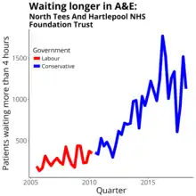 Proposals for reconfiguring hospitals in the area have been under consideration since the early 1990s.[1] A proposal to replace both existing hospitals with a new building at Wynyard is still under active consideration.[2] and services are being transferred between sites.[3] In October 2013 all emergency medical and critical care services were moved from Hartlepool (formerly Hartlepool General Hospital) to the University Hospital of North Tees (formerly North Tees General Hospital), in Stockton. The services remaining in Hartlepool are being concentrated in the central building.[4] The plans were suspended in October 2014 because of a lack of "high-level political support" ahead of May's general election. Former Stockton South MP James Wharton opposed the plans for the new hospital, arguing that £50m should be invested in North Tees.[5] The Hartlepool Mail is campaigning to have services restored to the University Hospital of Hartlepool.[6]