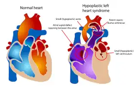 ![]() Diagram of a healthy heart and one with Hypoplastic left heart syndrome. In the heart on the right, note the near absence of the left ventricle, which normally provides systemic circulation. Following the three stage palliation (Norwood, Glenn or hemi-Fontan, then Fontan), blood flow from the right ventricle is rerouted to serve this function, which means that an alternative source of pulmonary circulation must be provided. | |