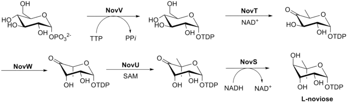 The biosynthesis of L-noviose (ring C) is shown in Fig. 3. This process starts from glucose-1-phosphate where NovV takes dTTP and replaces the phosphate group with a dTDP group. NovT then oxidizes the 4-hydroxy group using NAD+. NovT also accomplishes a dehydroxylation of the 6 position of the sugar. NovW then epimerizes the 3 position of the sugar.[26] The methylation of the 5 position is accomplished by NovU and S-adenosyl methionine (SAM). Finally NovS reduces the 4 position again to achieve epimerization of that position from the starting glucose-1-phosphate using NADH.