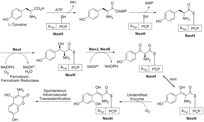 The biosynthesis of ring B (see Fig. 2) begins with the natural amino acid L-tyrosine. This is then adenylated and thioesterified onto the peptidyl carrier protein (PCP) of NovH by ATP and NovH itself.[24] NovI then further modifies this PCP bound molecule by oxidizing the β-position using NADPH and molecular oxygen. NovJ and NovK form a heterodimer of J2K2 which is the active form of this benzylic oxygenase.[25] This process uses NADP+ as a hydride acceptor in the oxidation of the β-alcohol. This ketone will prefer to exist in its enol tautomer in solution. Next a still unidentified protein catalyzes the selective oxidation of the benzene (as shown in Fig. 2). Upon oxidation this intermediate will spontaneously lactonize to form the aromatic ring B and lose NovH in the process.