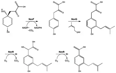 The biosynthesis of ring A (see Fig. 1) begins with prephenate which is a derived from the shikimic acid biosynthetic pathway. The enzyme NovF catalyzes the decarboxylation of prephenate while simultaneously reducing nicotinamide adenine dinucleotide phosphate (NADP+) to produce NADPH. Following this NovQ catalyzes the electrophilic substitution of the phenyl ring with dimethylallyl pyrophosphate (DMAPP) otherwise known as prenylation.[22] DMAPP can come from either the mevalonic acid pathway or the deoxyxylulose biosynthetic pathway. Next the 3-dimethylallyl-4-hydroxybenzoate molecule is subjected to two oxidative decarboxylations by NovR and molecular oxygen.[23] NovR is a non-heme iron oxygenase with a unique bifunctional catalysis. In the first stage both oxygens are incorporated from the molecular oxygen while in the second step only one is incorporated as determined by isotope labeling studies. This completes the formation of ring A.