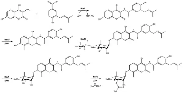 This aminocoumarin antibiotic consists of three major substituents. The 3-dimethylallyl-4-hydroxybenzoic acid moiety, known as ring A, is derived from prephenate and dimethylallyl pyrophosphate. The aminocoumarin moiety, known as ring B, is derived from L-tyrosine. The final component of novobiocin is the sugar derivative L-noviose, known as ring C, which is derived from glucose-1-phosphate. The biosynthetic gene cluster for novobiocin was identified by Heide and coworkers in 1999 (published 2000) from Streptomyces spheroides NCIB 11891.[21] They identified 23 putative open reading frames (ORFs) and more than 11 other ORFs that may play a role in novobiocin biosynthesis.