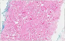 The tumors are unencapsulated and poorly circumscribed, showing a firm, white cut surface. Most tumors are about 3.5 cm, but can be up to 8 cm.[1] By microscopic examination, there are haphazardly arranged thick collagen fibers, with a low cellularity and no pleomorphism. There are usually entrapped fat cells, skeletal muscle, and peripheral nerves. The may be perineural fibrosis. The elastic fibers may be altered, which is why an elastofibroma is considered in the differential diagnosis.[1]
