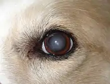 Nuclear sclerosis is an age-related change in the density of the crystalline lens nucleus that occurs in all older animals.[1] It is caused by compression of older lens fibers in the nucleus by new fiber formation. The denser construction of the nucleus causes it to scatter light. Although nuclear sclerosis may describe a type of early cataract in human medicine,[2] in veterinary medicine the term is also known as lenticular sclerosis and describes a bluish-grey haziness at the nucleus that usually does not affect vision, except for unusually dense cases. Immature senile cataract has to be differentiated with nuclear sclerosis while making its diagnosis.[3]