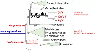 The general consensus is that Iridoviridae–Ascoviridae are closely related sister taxa in a clade. Pithovirus, Iridoviridae–Ascoviridae and Marseillevirus form a PIM or MAPI clade (Pimascovirales[2]) in trees built from conserved proteins.[6] The sister clade to PIM/MAPI is a clade made out of Algavirales[2] (Phycodnaviridae, Pandoraviridae), and possibly Imitervirales[2]/Mimiviridae ("P2" thereafter).[32] Poxviridae is consistently treated as a basal branch. Asfarviridae is either a sister group to Poxviridae (building together Pokkesviricetes)[2] or a member of the P2 clade.[33] The ICTV classification, as of 2019, matches the general shape of the tree.