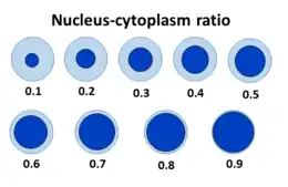 The nuclear-cytoplasmic ratio (also variously known as the nucleus:cytoplasm ratio, nucleus-cytoplasm ratio, N:C ratio, or N/C) is a measurement used in cell biology. It is a ratio of the size (i.e., volume) of the nucleus of a cell to the size of the cytoplasm of that cell.[1]