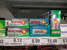 Nurofen is a brand name range of pain-relief medication containing ibuprofen made by the British multinational Reckitt.[1] Introduced in 1983, the Nurofen brand was acquired following Reckitt Benckiser's acquisition of Boots in 2005. The brand is primarily marketed and sold in the United Kingdom,[1] other parts of Europe, South Africa, Australia and New Zealand. In 2016 it was the biggest selling branded over-the-counter medication sold in Great Britain, with sales of £116.8 million.[2]