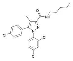 - Francisco ME, Seltzman HH, Gilliam AF, Mitchell RA, Rider SL, Pertwee RG, et al. (June 2002). "Synthesis and structure-activity relationships of amide and hydrazide analogues of the cannabinoid CB(1) receptor antagonist N-(piperidinyl)- 5-(4-chlorophenyl)-1-(2,4-dichlorophenyl)-4-methyl-1H-pyrazole-3-carboxamide (SR141716)". Journal of Medicinal Chemistry. 45 (13): 2708–19. doi:10.1021/jm010498v. PMID 12061874.