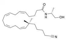 O-1812 is an eicosanoid derivative related to anandamide that acts as a potent and highly selective agonist for the cannabinoid receptor CB1, with a Ki of 3.4 nM at CB1 and 3870 nM at CB2.[1] Unlike most related compounds, O-1812 is metabolically stable against rapid breakdown by enzymes, and produces a cannabinoid-like discriminative effect in rats, which is similar but not identical to that produced by cannabinoid drugs of other chemical classes.[2][3][4][5]