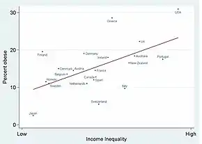The "a calorie is a calorie" model of obesity posits a combination of excessive food energy intake and a lack of physical activity as the cause of most cases of obesity.[94] A limited number of cases are due primarily to genetics, medical reasons, or psychiatric illness.[15] In contrast, increasing rates of obesity at a societal level are felt to be due to an easily accessible and palatable diet,[95] increased reliance on cars, and mechanized manufacturing.[96][97]