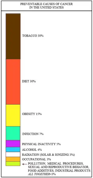About 75-80% of all cancers in the United States are preventable, if risk factors are avoided[4] (also see (Cancer prevention). Obesity appears to be the third most important risk factor for cancer in the United States, just behind tobacco and diet (see Figure). Obesity is the source of about 15% of all preventable cancers.[5][6][7]