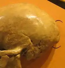 An occipital bun, also called an occipital spur, occipital knob, chignon hook or inion hook, is a prominent bulge or projection of the occipital bone at the back of the skull. It is important in scientific descriptions of classic Neanderthal crania.[1] It is found among archaic Homo species (including Neanderthals), as well as Upper Pleistocene Homo sapiens and present-day human populations.[2]
