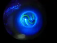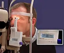 Goldmann tonometry is considered to be the gold standard IOP test and is the most widely accepted method.[4][5] A special disinfected prism is mounted on the tonometer head and then placed against the cornea. The examiner then uses a cobalt blue filter to view two green semicircles. The force applied to the tonometer head is then adjusted using a dial connected to a variable tension spring until the inner edges of the green semicircles in the viewfinder meet. When the area of a circle with diameter 3.06 mm (0.120 in) has been flattened, the opposing forces of corneal rigidity and the tear film are roughly approximate and cancel each other out allowing the pressure in the eye to be determined from the force applied. Like all non-invasive methods, it is inherently imprecise and may need to be adjusted.[6][7]