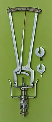 Impression tonometry (also known as indentation tonometry) measures the depth of corneal indentation made by a small plunger carrying a known weight. The higher the intraocular pressure, the harder it is to push against and indent the cornea. For very high levels of IOP, extra weights can be added to make the plunger push harder.[14] The movement of the plunger is measured using a calibrated scale.[14] The Schiøtz tonometer is the most common device to use this principle.