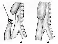 In a minority of cases, the gap between upper and lower esophageal segments may be too long to bridge. In these situations traditional surgical approaches include gastrostomy followed by gastric pull-up, colonic transposition and jejunum transposition.[13] Gastric pull-up has been the preferred approach at many specialized centers, including Great Ormond Street (London) and Mott Children's Hospital (Ann Arbor).[14] Gastrostomy, or G-tube, allows for tube feedings into the stomach through the abdominal wall. Often a cervical esophagostomy will also be done, to allow the saliva which is swallowed to drain out a hole in the neck. Months or years later, the esophagus may be repaired, sometimes by using a segment of bowel brought up into the chest, interposing between the upper and lower segments of esophagus.[15]