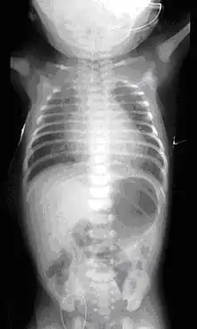 Esophageal atresia is a congenital medical condition (birth defect) that affects the alimentary tract. It causes the esophagus to end in a blind-ended pouch rather than connecting normally to the stomach. It comprises a variety of congenital anatomic defects that are caused by an abnormal embryological development of the esophagus. It is characterized anatomically by a congenital obstruction of the esophagus with interruption of the continuity of the esophageal wall.[2]