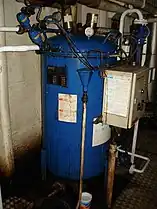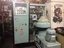 A centrifugal water–oil separator, centrifugal oil–water separator or centrifugal liquid–liquid separator is a device designed to separate oil and water by centrifugation. It generally contains a cylindrical container that rotates inside a larger stationary container. The denser liquid, usually water, accumulates at the periphery of the rotating container and is collected from the side of the device, whereas the less dense liquid, usually oil, accumulates at the rotation axis and is collected from the center. Centrifugal oil–water separators are used for waste water processing and for cleanup of oil spills on sea or on lake. Centrifugal oil–water separators are also used for filtering diesel and lubricating oils by removing the waste particles and impurity from them.[3]