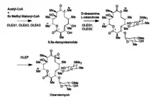 The genes OleG1 and G2 are responsible for the glycosyltransferases that attach oleandomycin’s characteristic sugars to the macrolide. These sugars are derived from TDP-glucose. OLEG1 transfers dTDP-D-desoamine and OleG2 transfers D-TDP-L-oleandrose to the macrolide ring. The epoxidation that occurs afterwards is from the enzyme encoded by OleP, which could be homologous with a P450 enzyme. The method by which OleP epoxidates is suspected to be a dihydroxylation followed by the conversion of a hydroxyl group into a phosphate group that then leaves via a nucleophilic ring closure by the other hydroxyl group.[10]