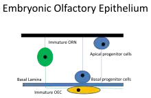 The embryonic olfactory epithelium consists of fewer cell types than in the adult, including apical and basal progenitor cells, as well as immature olfactory sensory neurons.[9] Early embryonic neurogenesis relies mostly on the apical cells, while later stage embryonic neurogenesis and secondary neurogenesis in adults relies on basal stem cells.[10] The axons of the immature olfactory sensory neurons, along with a mixed population of migratory cells, including immature olfactory ensheathing cells and gonadotropin-releasing hormone neurons form a “migratory mass” that travels towards the olfactory bulb.[9][10] At the end of the embryonic stage, the epithelium develops into a pseudostratified columnar epithelium and begins secondary neurogenesis.[9]