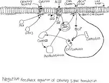 The olfactory receptor neuron has a fast working negative feedback response upon depolarization. When the neuron is depolarizing, the CNG ion channel is open allowing sodium and calcium to rush into the cell. The influx of calcium begins a cascade of events within the cell. Calcium first binds to calmodulin to form CaM. CaM will then bind to the CNG channel and close it, stopping the sodium and calcium influx.[10] CaMKII will be activated by the presence of CaM, which will phosphorylate ACIII and reduce cAMP production.[11] CaMKII will also activate phosphodiesterase, which will then hydrolyze cAMP.[12] The effect of this negative feedback response inhibits the neuron from further activation when another odor molecule is introduced.