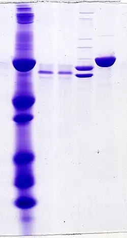 Two methods of analysis are possible: (a) protein electrophoresis, a method of analyzing the composition of fluids, also known as "SDS-PAGE (sodium dodecyl sulphate polyacrylamide gel electrophoresis)/Coomassie blue staining", and (b) the combination of isoelectric focusing/silver staining. The latter is more sensitive.[1]