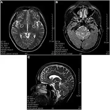 In 1999, an autopsy study by Johannes Kornhuber of 8 patients who had received amantadine therapy looked at the selectively vulnerable brain regions where Olney's lesions occur, the cingulate and retrosplenial cortex, and found no evidence of Olney's lesions.[10][11]