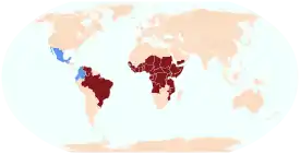 About 99% of cases of onchocerciasis are found in 31 countries in sub-Saharan Africa, although areas of limited transmission occur in Brazil, Venezuela, and Yemen.[15] The disease is thought to have been imported into Latin America through the slave trade.[18] Onchocerciasis was eliminated from Colombia in 2013, Ecuador in 2014, Mexico in 2015, and Guatemala in 2016[16] due to control programs that used mass drug administration with ivermectin.[15]