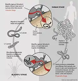 - The microfilariae are taken up by a female blackfly when it takes a blood meal, thus completing the lifecycle of O. volvulus.[5]