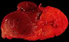 Oncocytoma of the salivary gland. This lesion presented as a lateral anterior neck mass. At surgery, it was found to be a soft 3.0 × 2.1 × 1.8 cm tumor of the submandibular salivary gland. The photo shows the characteristic dark color of an oncocytoma, a rare type of benign neoplasm, at the left side of the image (the normal lobulated salivary gland tissue is to the right).